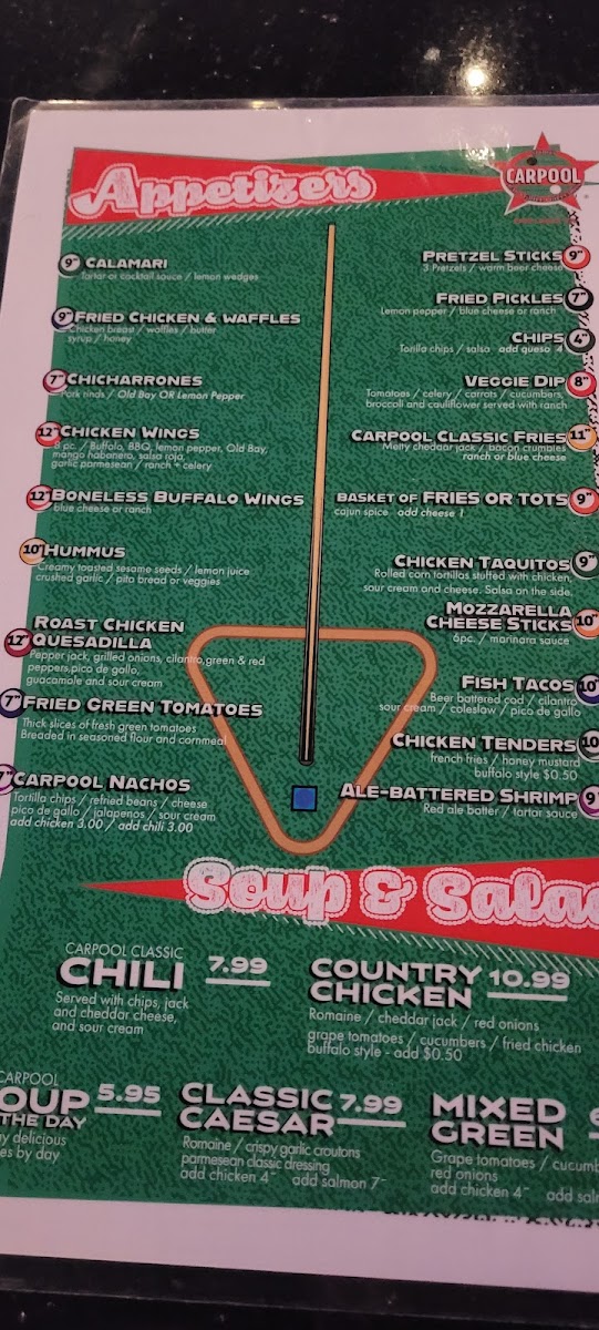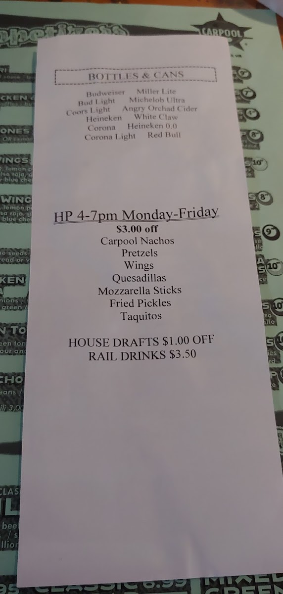 Pair your food with a lineup of classic beers like Stella and Heineken, or unwind with a well-poured rail whiskey or tequila cocktail. The menu’s approachable drinks and snacks support CarPool’s vibrant setting, where pool tables and games create a casual, engaging space to relax with friends.