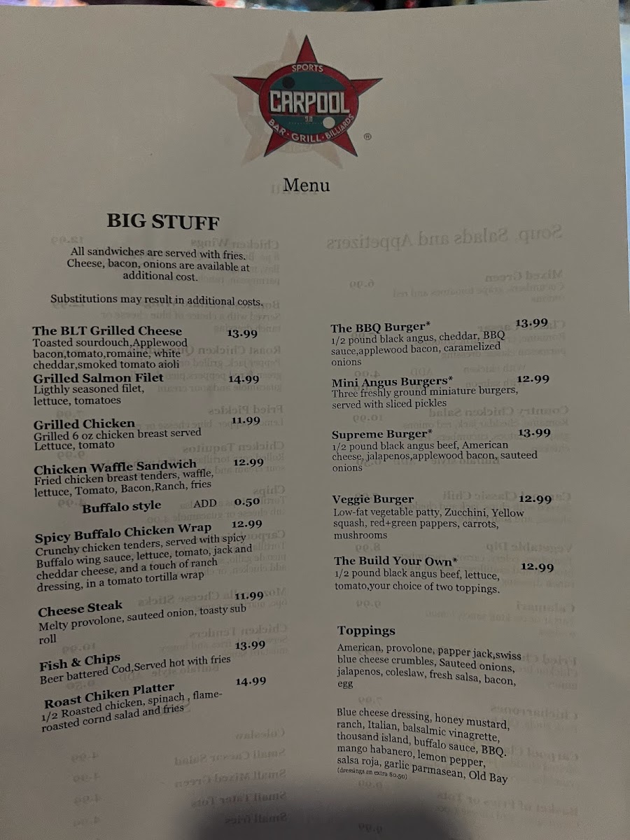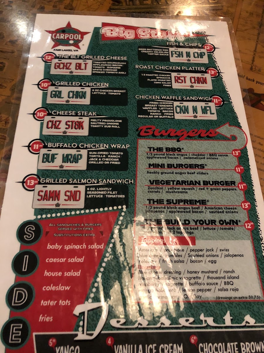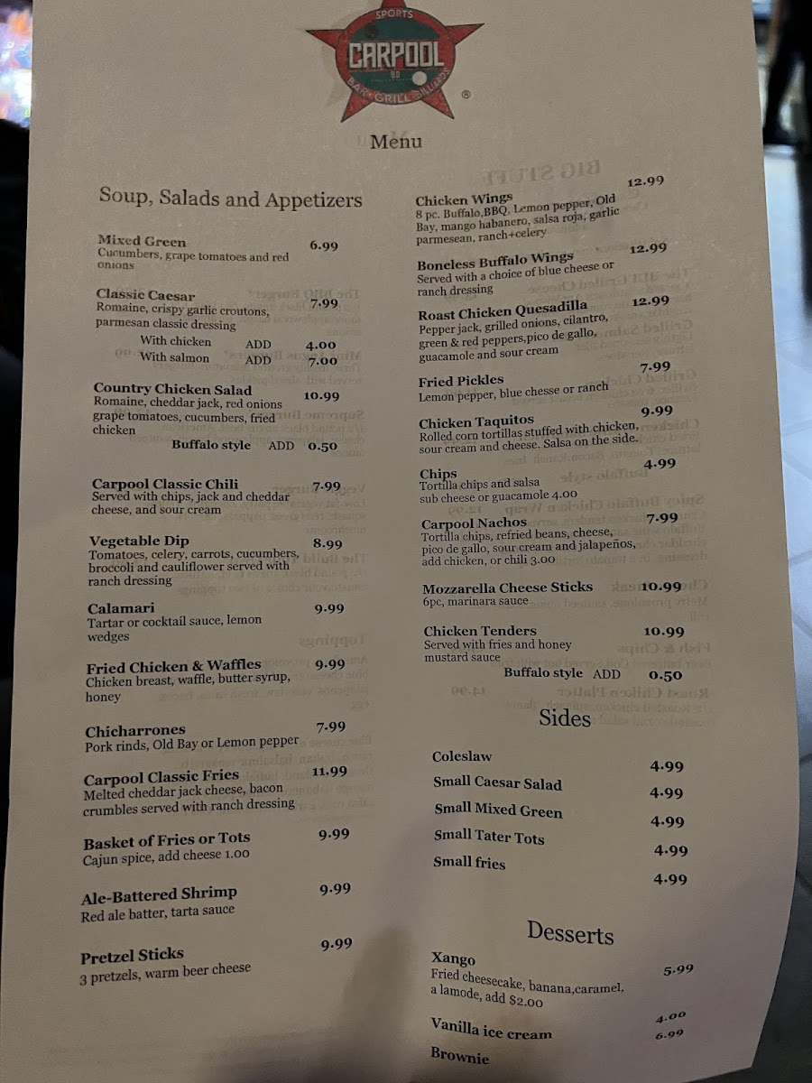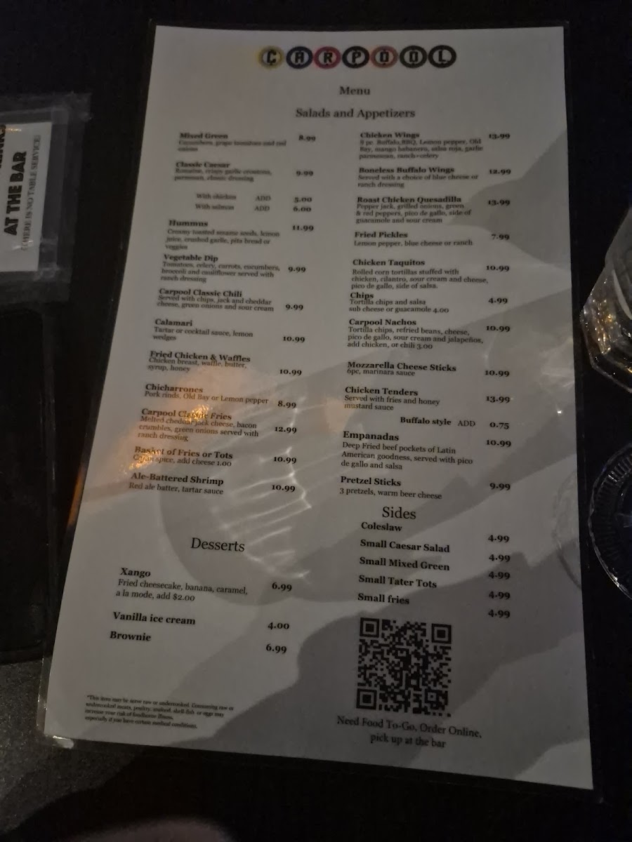 The CarPool menu offers a straightforward selection of casual bar favorites designed to complement a lively and social atmosphere. Expect comforting, shareable bites like fried pickles, mozzarella sticks, and nachos, alongside heartier options such as pork rib tips and roast chicken platters. These dishes naturally fit weekend nights out, friendly gatherings, or game day hangouts, where easy-to-eat plates keep the focus on conversation and fun.